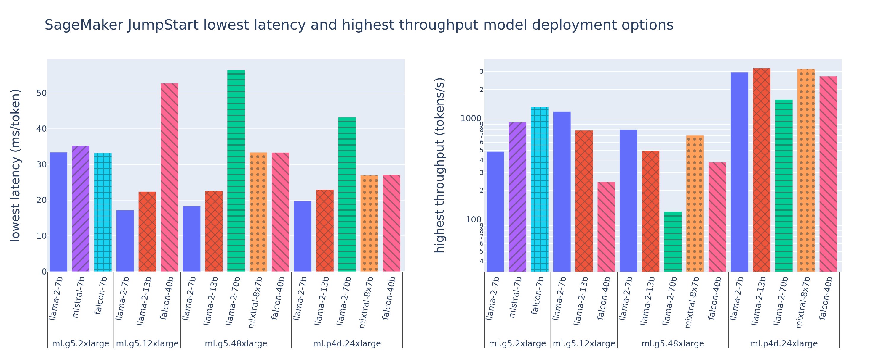 The following figure shows the lowest latencies (left) and highest throughput (right) values for deployment configurations across a variety of model types and instance types. Importantly, each of these model deployments use default configurations as provided by SageMaker JumpStart given the desired model ID and instance type for deployment.