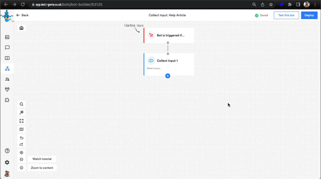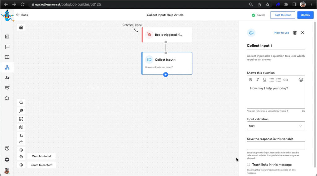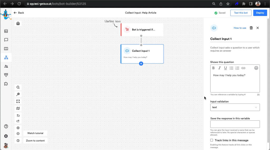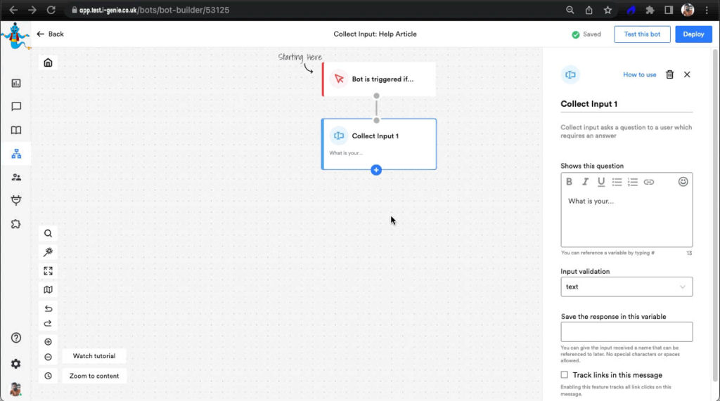 Collect Input is an action block that’s used when you as a business want to ask questions to the visitor and expect answers in return. And you don’t want to just collect any random input, like if you’re asking for the visitor’s email and they input ‘abcdefgh’, it wouldn’t make sense to move ahead in the conversation without receiving a valid input.