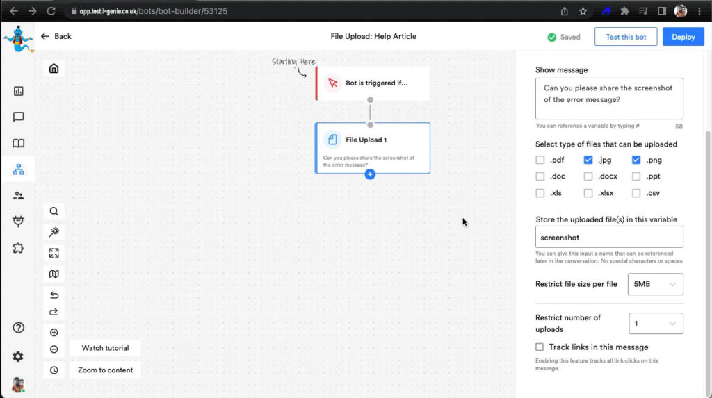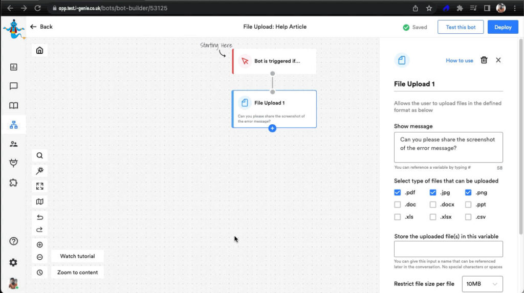 File Upload block is used when you would like users to submit documents/files through the bot. This block allows the users to share the files in various formats