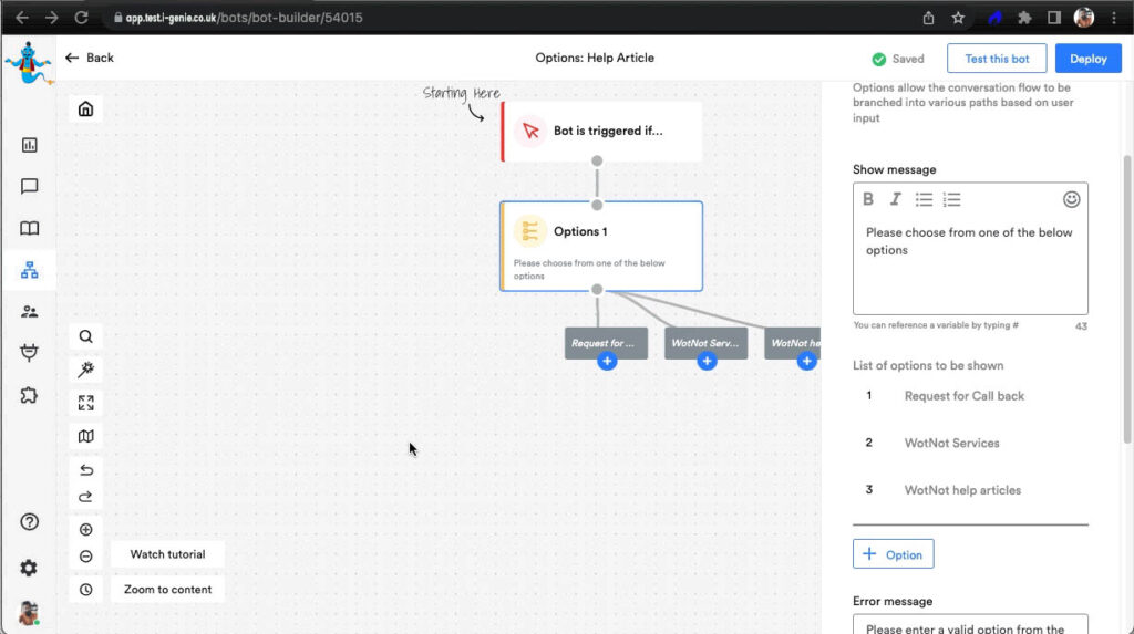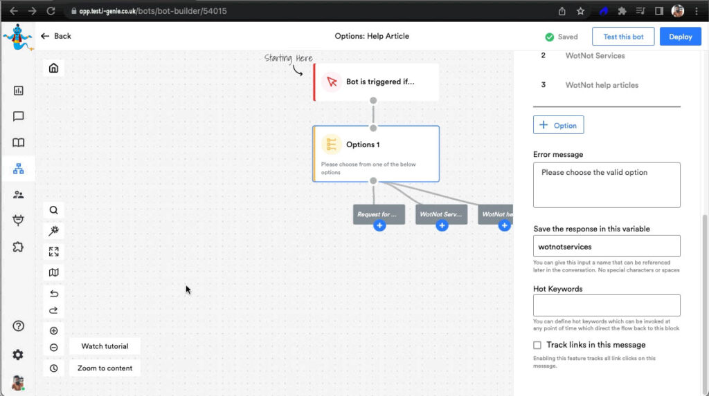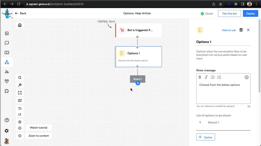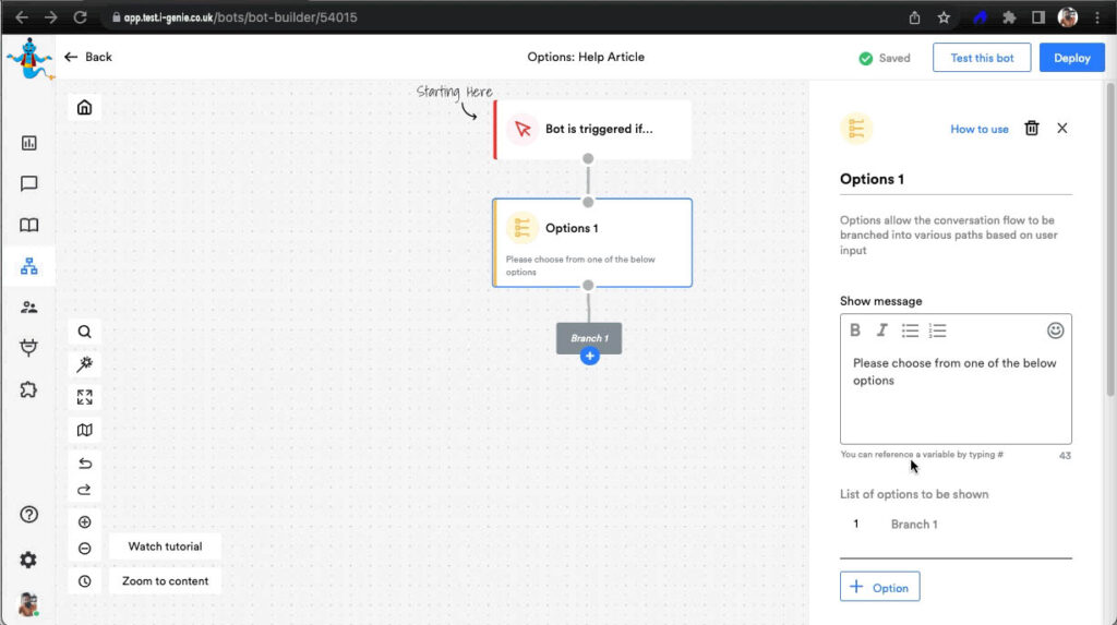 Option Block is usually used when you are building a bot for WhatsApp & SMS channel where buttons are not permitted. It provides options to the users to branch the conversation & go down its path. Each option can either have the same path or different paths moving from it.