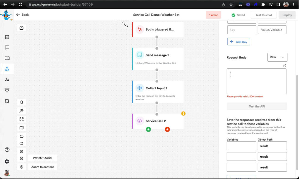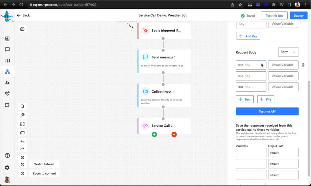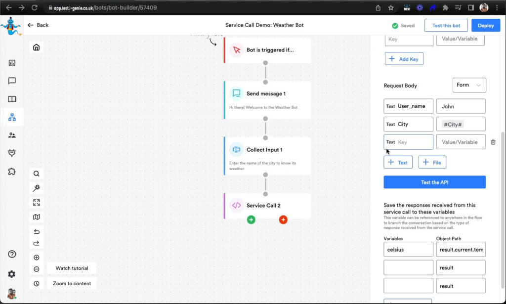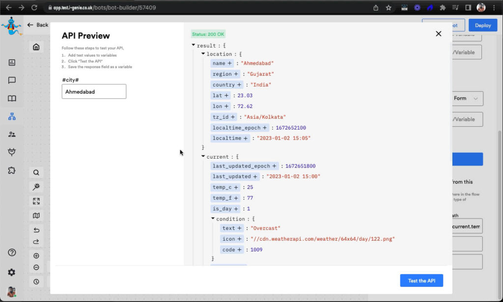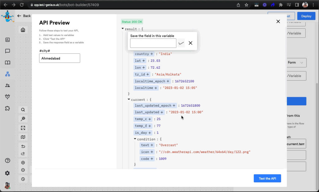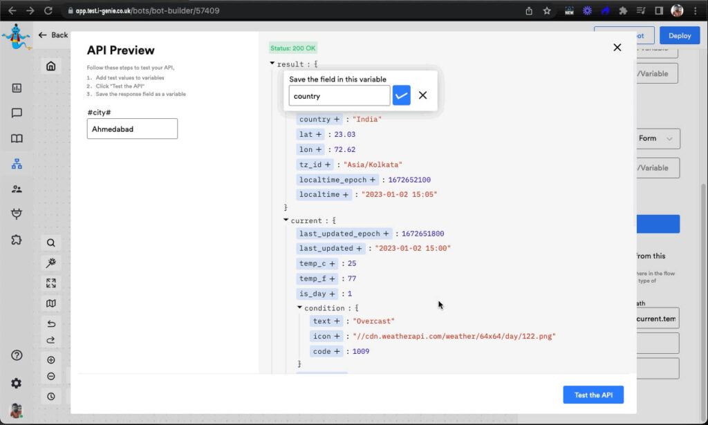 You can further store the responses received from the API into the variables which can be further used in the bot flow or bot message. i-genie follows the dot pattern to store the responses into the variables. Below are few of the ways in which the path can be defined