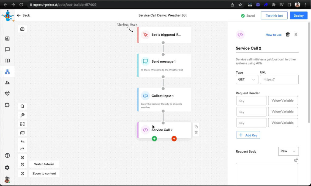 To add the ‘Service Call’ action block on canvas, click on ‘+’ sign and look for ‘Service Call’
